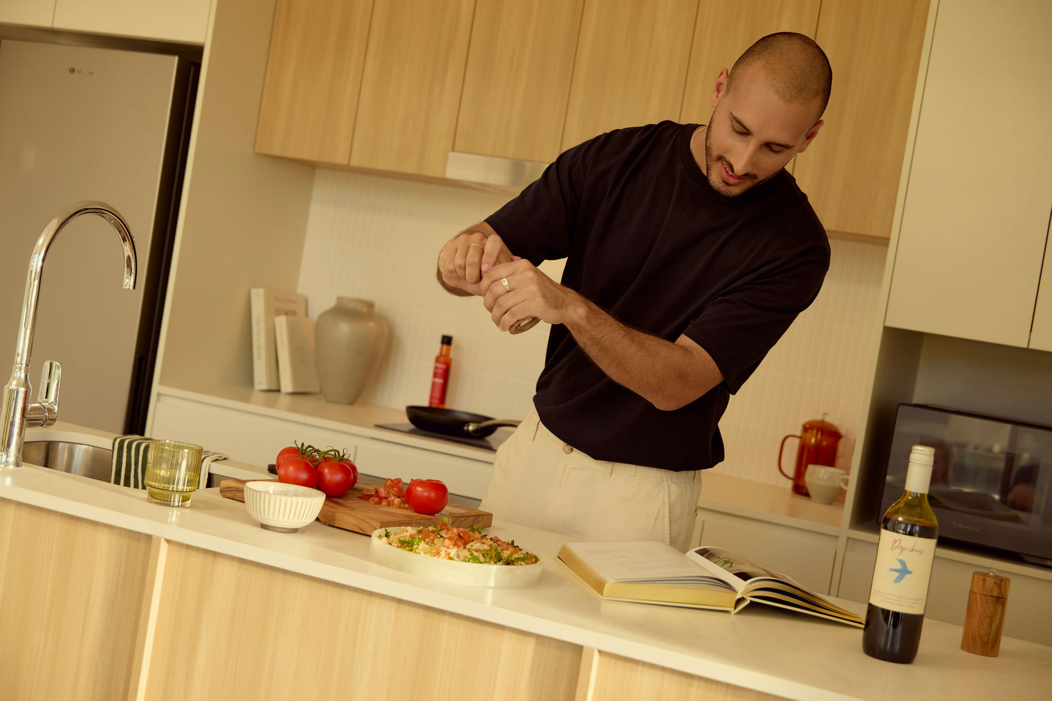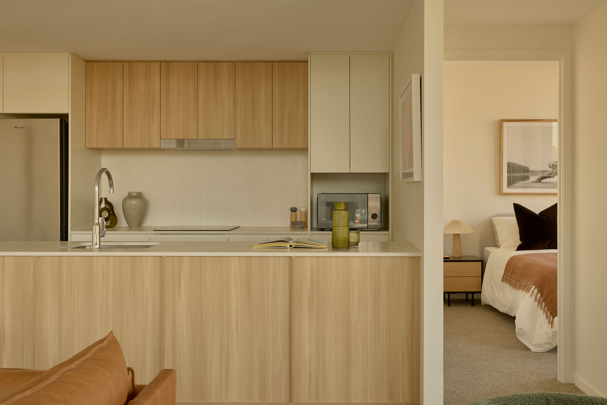 - Timber-look and white kitchen joinery with tiled splashback